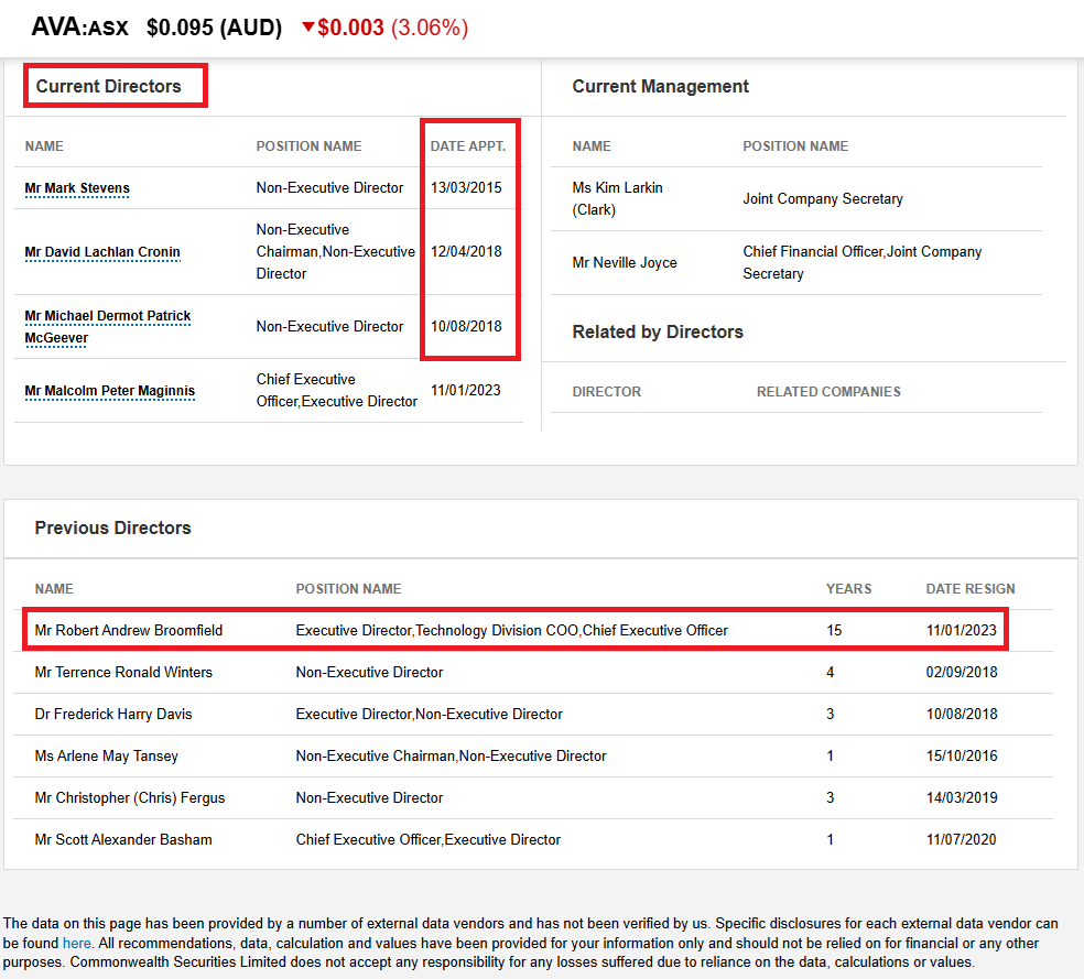 AVA's CFO, Neville Joyce, has been serving as the Group Chief Financial Officer (CFO) and Company Secretary at Ava Risk Group since November 3, 2021. He succeeded Leigh Davis, who resigned from the position in August 2021. It appears that Kim Larkin was added as a second (i.e. joint) company secretary last year (2024).