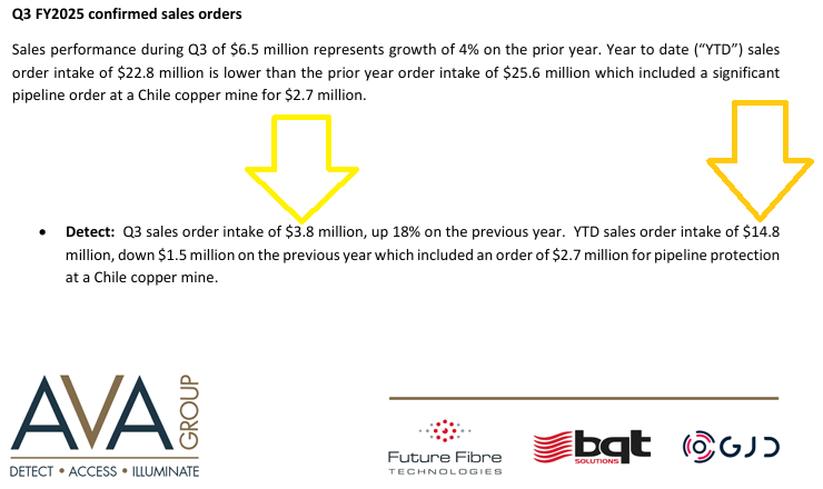 Looks like a -2.56% (-3%) drop to me also, not an +18% rise. The Yellow arrows that I've added (above and below) point to the Q3 sales order intake numbers for Detect, and the Orange arrows point to the year to date (YTD) numbers for Detect at that time (for 3 quarters). They say below that their YTD number (Q1 to Q3 of FY2025) is $1.5 million down on the same time last year, however it's actually $2.0 million down - from $16.8 m to $14.8 m.