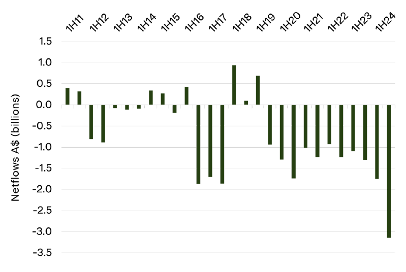 That share price performance has come on the back of extended periods of underperformance from both companies’ flagship funds, leading to persistent and significant investor withdrawals. From a peak of $26 billion, Platinum now manages a touch over $10 billion and suffered more than $840 million in net redemptions in November alone. Magellan’s outflows have stabilised—as has its share price throughout2024—but with $39 billion under management, the company is a shadow of its former self (at its peak in November 2021, Magellan managed $100 billion of investor money).