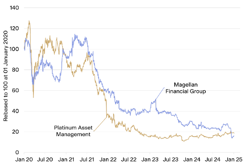 The past five years should have been a wonderful period for the owners of international fund managers. The MSCI World Index has almost doubled. Institutional and retail investors have been steadily increasing their allocations to global equities. Yet the ASX’s two highest-profile global managers, Platinum Asset Management and Magellan Financial Group, have both experienced 80% share price falls since the end of 2019.