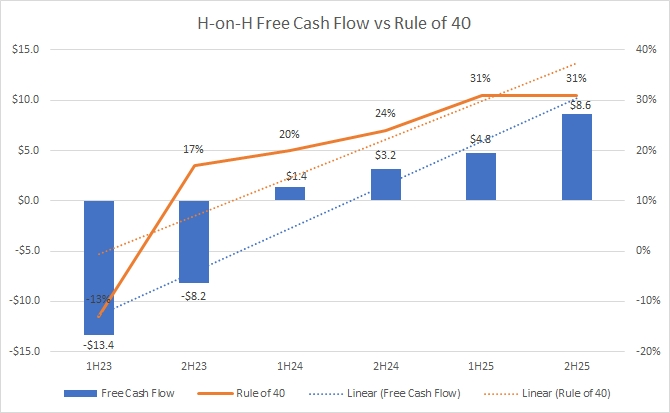 The acceleration in FCF is very evident HoH in this chart. But Rule of 30 was actually flat HoH