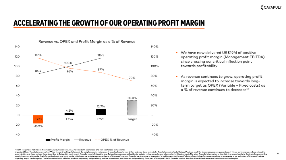 Still, its important to note that Catapult is still making a statutory loss, largely due to a hefty D&A expense. If the depreciation schedule accurately reflects the ongoing capital investment needed to sustain operations, then the business still has a way to go before it can be considered truly profitable. That said, Catapult is still very much in a growth phase. And if you isolate just the depreciation tied to hardware and leased assets — arguably more reflective of steady-state operations — the business is not far off breakeven on a statutory basis. The heavier amortization tied to growth investments like Vector and Hub Pro can reasonably be discounted for now, assuming these initiatives underpin sufficient future revenue. If that revenue materialises, this dynamic should shift, especially as the business continues to flex its operating leverage and compound its already improving free cash flow profile.