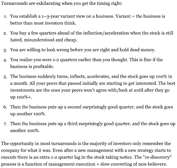 @Arizona , GS's comments align to what Ian Cassel describes typically occurs in steps 5-7 of his Turnarounds framework, a framerwork that has really, really served me well. The hardest part is steps 1 to 4, especially when the rest of the crowd thinks you have completely lost the plot.