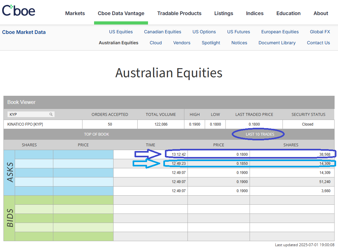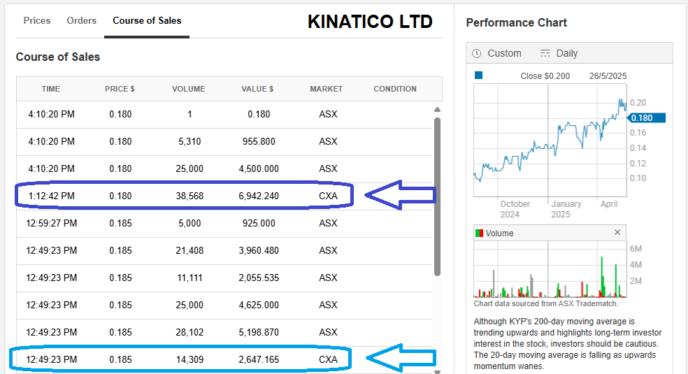i.e. Cboe only had five KYP trades go through all day, and the most recent two - which I've highlighted there in blue (above and below) - match up to the ones labelled CXA in the ASX summary below: