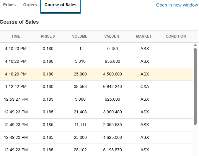 - During the pre-CSPA period that runs from 4pm to 4:10pm, probably very close to 4:10 (the cut-off), two sell orders were placed on the ASX - one for 25,000 shares and the other for 5,310 shares, both at $0.185 (18.5 cents/share) which moved them above you in the queue (because of the higher buy price); then