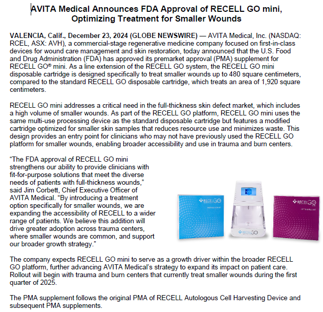 A much-expected-but-good-to-finally-see-it FDA approval for RECELL GO was received by AVH overnight. AVH has been all set to launch to market the day it got FDA approval. This could well be the turning point for the rough past 6M.