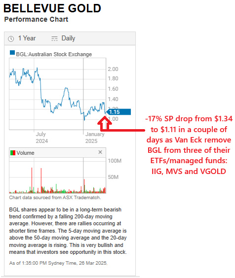 So VanEck have reduced their exposure to BGL across many if not all of their ETFs and Managed Funds that did hold BGL, and they have completely removed BGL from three of them. If we went back and looked at their previous notice, we might find even more ETFs or Managed Funds that previously did hold Bellevue Gold (BGL), but that no longer do.