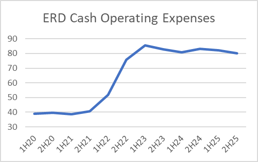 ERD capitalises some expenses such as software development and customer acquisition costs which can make the operating cost base in the profit and loss statement a bit misleading, but looking purely at the cash being spent each year it is clear to see how the cost base rationalisation has played out over the last few years: