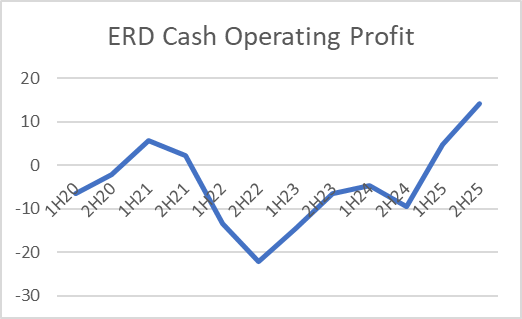 The US has been challenging for some time and a return to strong growth was not part of my original investment thesis. ERD's top line has been modest growth for some time, but management had done well to rationalise the cost base which had resulted in what I thought was a sustainable cash profit base to build from: