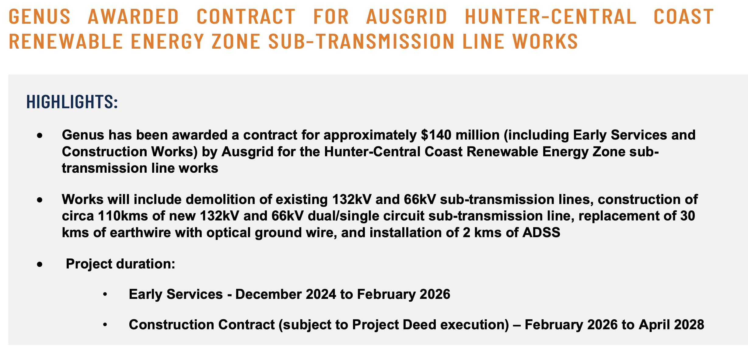 The power installation contract has a value of approximately $16 million. The contract is scheduled to commence immediately and be completed over a period of approximately 6 months. The works will be completed by our Queensland branch. The scope of work includes the installation, testing and commissioning of high voltage electrical cables and associated equipment as part of the new and upgrading of existing facilities and infrastructure.