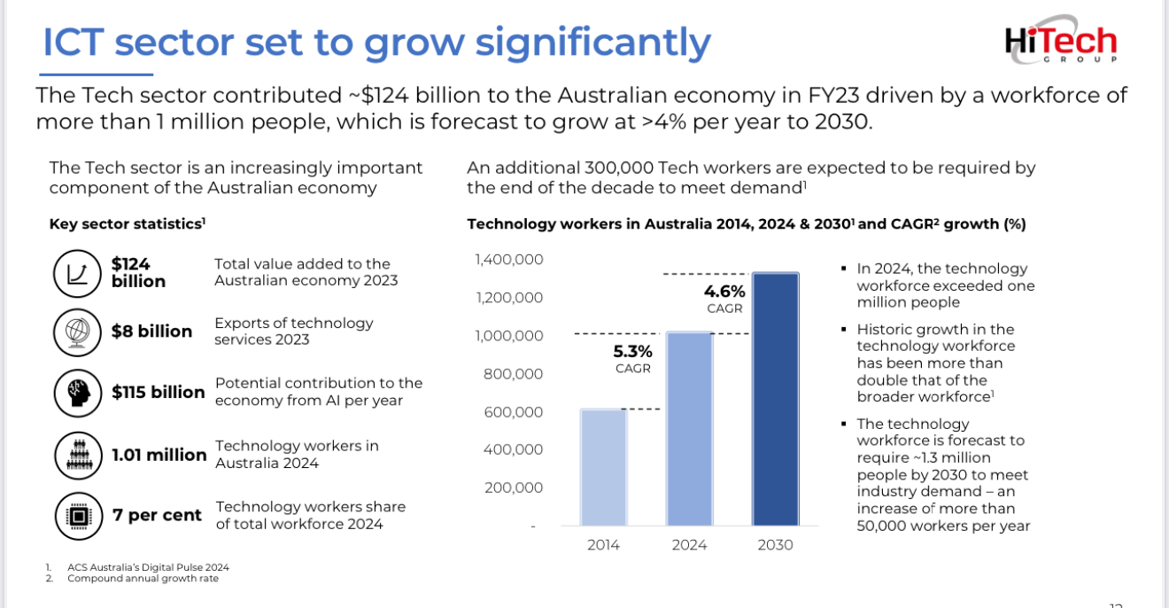 HiTech is well positioned to capture market demand for ICT talent and services with a strong balance sheet and long-term supplier agreements in place. The Australian Government has targeted a reduction in ICT contracting in some agencies. We have seen a reduction in contracting agreements leading into the end of the calendar year, however, there are several Government agencies still looking to bolster their talent pool, especially in the cyber security and digital infrastructure space which should counter the other agencies’ reduction.