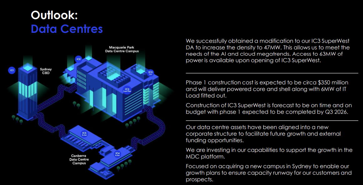 No change to the outlook provided in terms of the development of IC3 Super West. The 1st part of construction is expected to be completed in Q3 2026 at a cost of $350m with an expected 6MW of IT load available. The total load for IC3 SW has also been increased to 47MW.