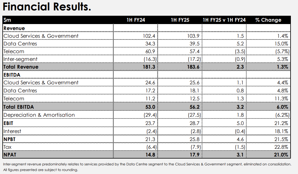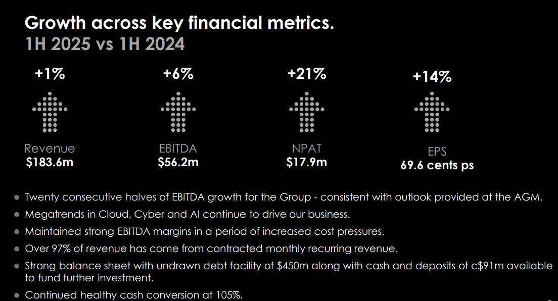 Chairman Peter James said, “Our strategy of investing in Data Centres, Cloud and Cyber Security continues to drive further shareholder value and ongoing returns and has resulted in thirteen halves of profitable growth”.
