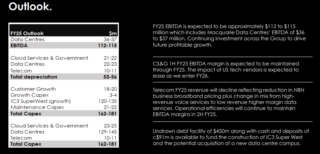 Outlook was somewhat muted considering IC3 SW has been part of plans for a while now. MAQ expect that the first phase will be online around 3Q 2026 bringing an extra 6MW of capacity. I guess the market probably also didn't like the fact that MAQ expect growth rates in the Cloud and Government segments to slow in the coming FY.