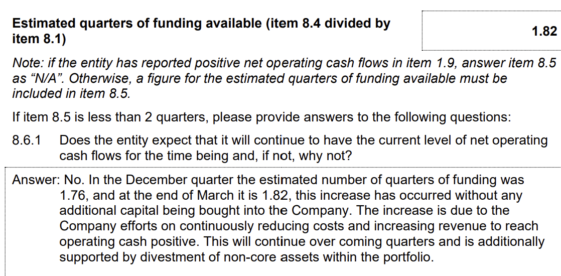 Having a bit of a look at this, and assuming they reach this point at the end of FY23. At Dec 21 the company had $13m in cash available or 4.6 Qtrs at the current operating cash outflow of $2.8m (including $676k of Reckon dividends).