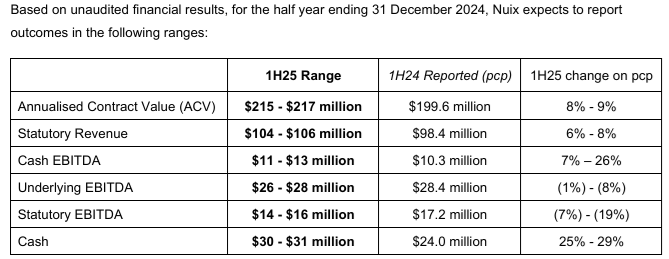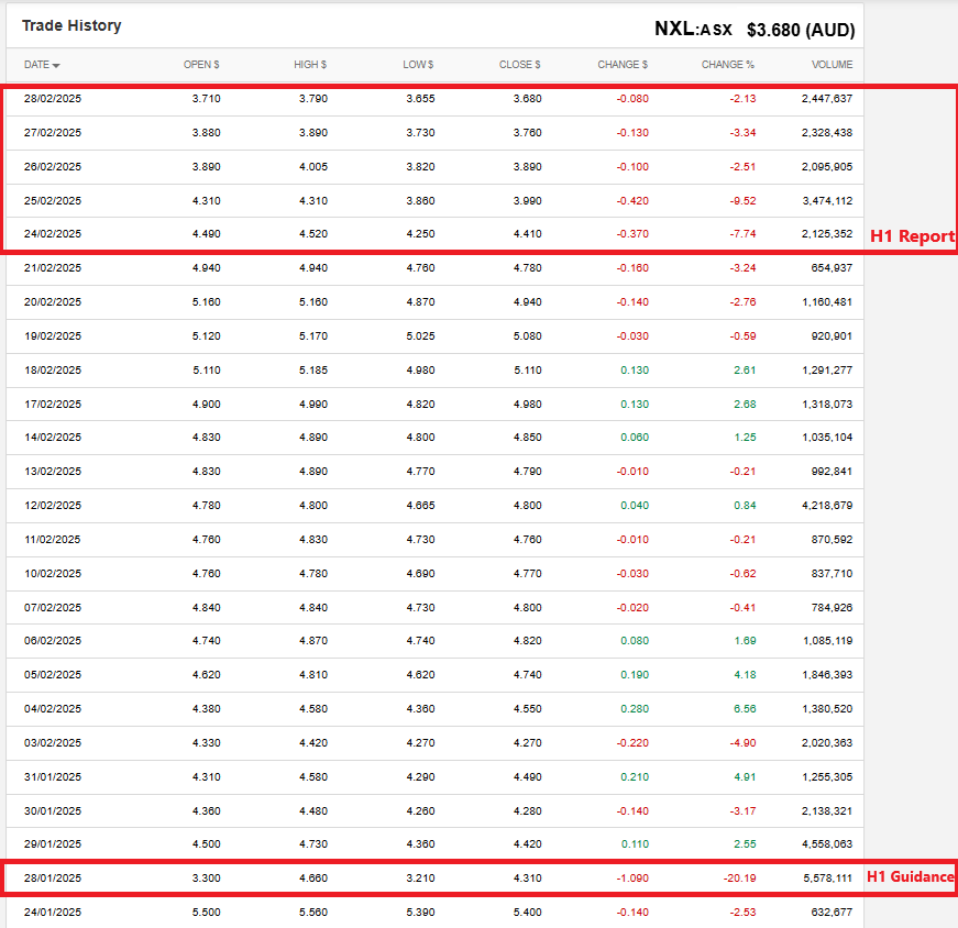 You can see on that 5 year chart (above, right) that they were powering back up at a very good clip, and then they had their AGM on 13-Nov-2024 and that was the end of that. Their SP dropped -22% on that day, then another -20% on 28th Jan (2025) when they released this: NXL-1H25-Results-Update-28-Jan-2025.PDF - Here's a snippet from that: