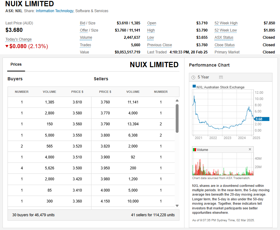 From a starting point of 3 years ago - beginning of March 2022 - Nuix was bouncing along with a negative return and then went from -43% down on July 12th, 2023 to +463% up on the last day of October 2024, and despite it being all downhill from there, they're still trading at levels that are +167.6% higher than 3 years ago, but, that being said, they're also back in a strong downtrend, so... there's that.