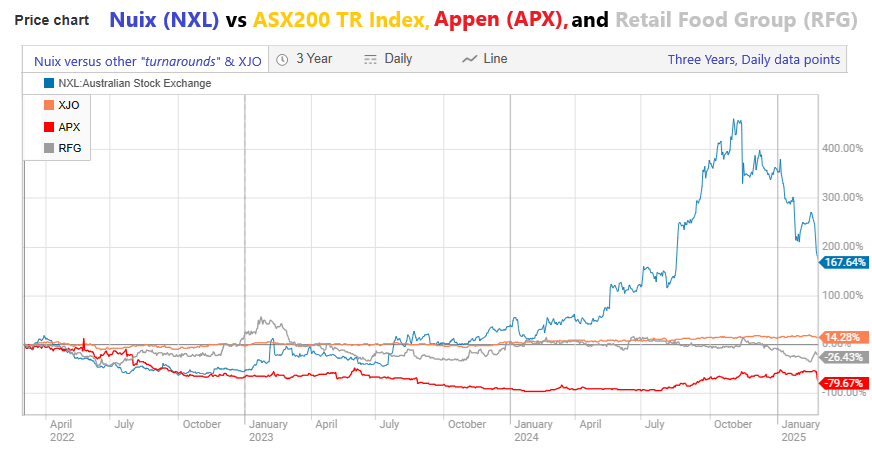 Still, if you look at them over the past 3 years against a couple of other companies that were also supposed to be turning around and heading north again, Retail Food Group (RFG) and Appen (APX), at least Nuix are still ahead of where they were 3 years ago; those other two are not: