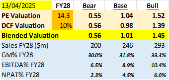 Well, if we take management's targets at face value, you're looking at a FY28 revenue and EBITDA of $300m and $24m respectively. Ideally, that's be an NPAT of ~$14m or so. That compares to a pro-forma NPAT in FY24 (assuming a full year contribution from force) of roughly $3 - 3.5m or so.