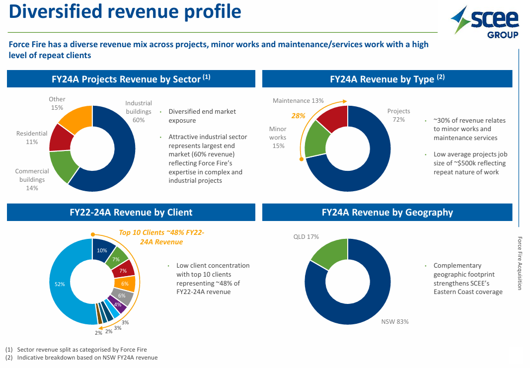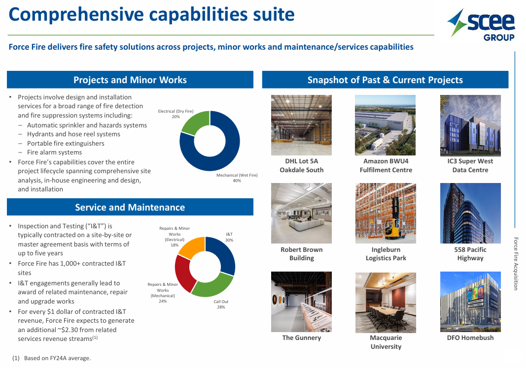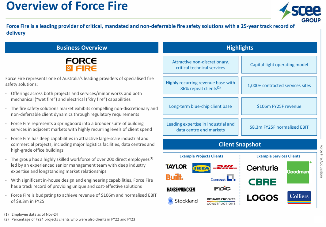 EPS accretive (of course): The transaction is forecast to result in at least 18% EPS accretion on a FY25 pro forma basis. The impact to SCEE is anticipated to be broadly neutral in FY25 as Force Fire’s contribution in FY25 will be offset by the transaction costs. Their contribution in FY26 is forecast to be at least $10m EBIT.