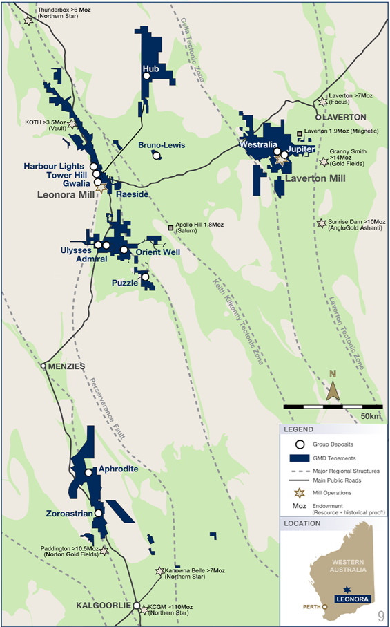 Below is that same area as the above map, but expanded to show GMD's other 100%-owned gold development projects (Aphrodite and Zoroastrian) which are south of Leonora and closer to Kalgoorlie: