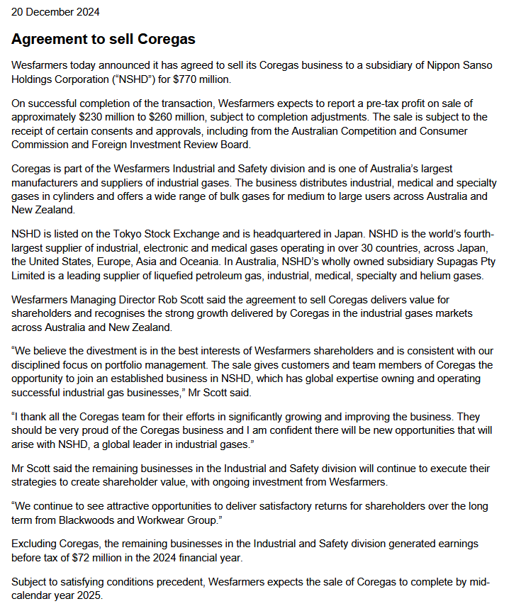 They've divested Coles, are progressing Covalent, and are building out WES Health now. No change to the investment thesis. They will continue to grow and their share price will continue to rise over time to reflect that growth. Unlike a company that sticks to a single sector and can become mature, WES keep morphing into new areas and changing parts of themselves, developing new arms, then selling some of those off once they've weaved their magic (turned them around with their savvy business, marketing and supply chain know-how), so every 5 years you can look at Wesfarmers and some of it will be the same (like Bunnings) and some of it will be different (like no Coles now but they have API and are running the ruler over RHC).